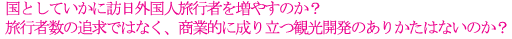 リピーターを増やすには、観光客に「また来たい!」と思わせるものが必要です。いくらマーケティングでアピールしても、その観光地が期待外れであれば、リピーターにはなりません。リピーターを増やすためには、マーケティングと称して大々的にプロモーション活動を行う前に、国内の観光を取り巻くハードおよびソフトの環境整備に力を注ぐことが重要課題です。